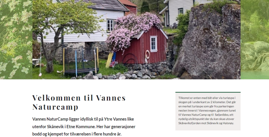 Vannes naturcamp ligger uten for Skånevik i Etne kommune og tilbyr ulike arrangementer i idylliske omgivelser, samt utleie. AFFY har levert hjemmeside med bookingsystem.