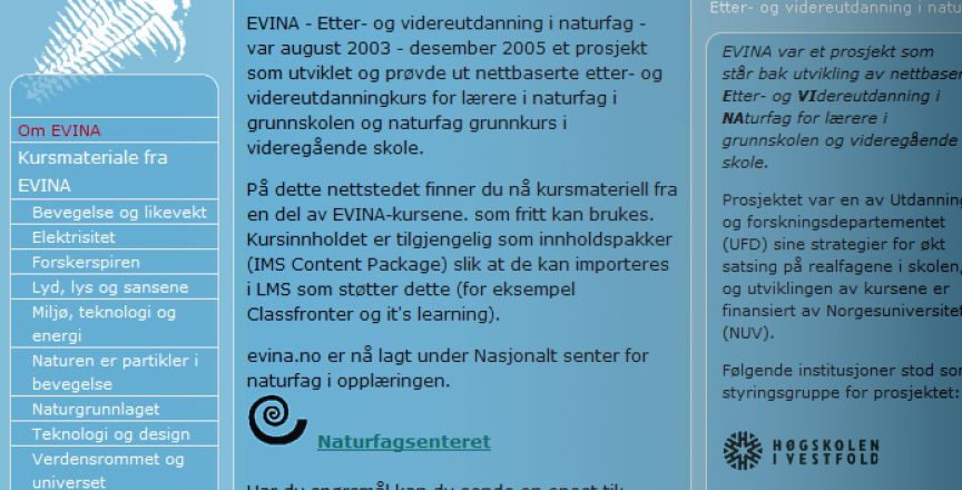 EVINA - Etter- og videreutdanning i naturfag - var august 2003 - desember 2005 et prosjekt som utviklet og prøvde ut nettbaserte etter- og videreutdanningkurs for lærere i naturfag i grunnskolen og naturfag grunnkurs i videregående skole. AFFY leverte